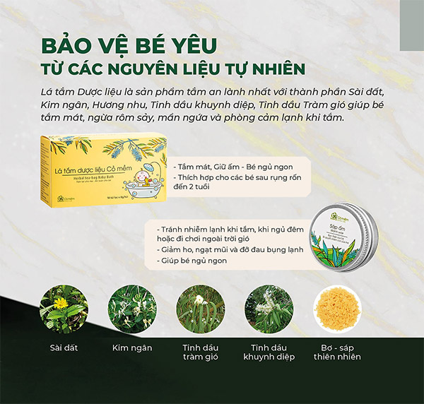 Bên cạnh đó, Lá tắm Dược liệu có chứa tinh dầu Tràm gió và tinh dầu Khuynh diệp là 2 loại tinh dầu thiên nhiên thích hợp trong việc giữ ấm cho bé. Nên đây được xem là sản phẩm hoàn toàn phù hợp khi tắm cho bé vào mùa lạnh.