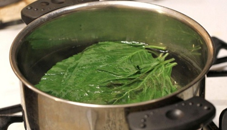 Cho lá tía tô và 1 thìa muối biển vào nồi, chế nước và đun sôi cho tới khi sôi khoảng 5 phút thì tắt bếp.