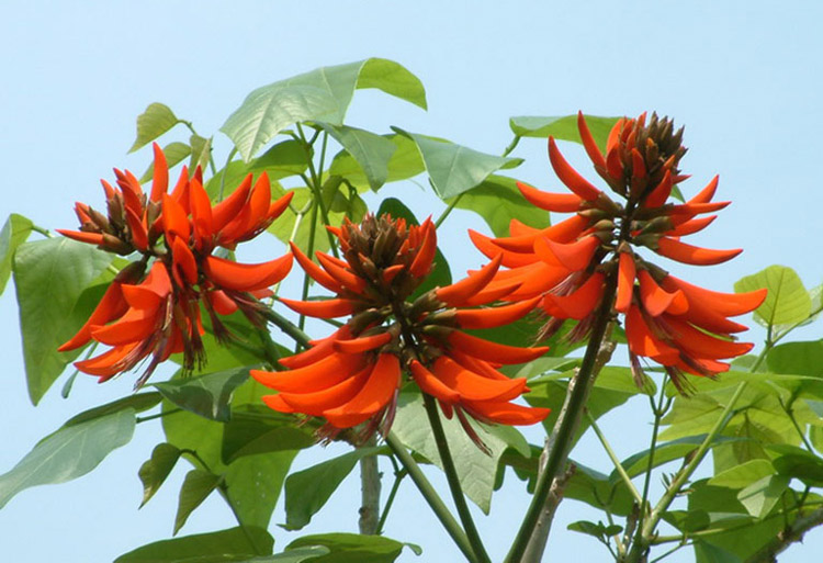 Hoa cây vông nở vào mùa hè, có màu đỏ tươi nổi bật và mọc thành chùm dầy.