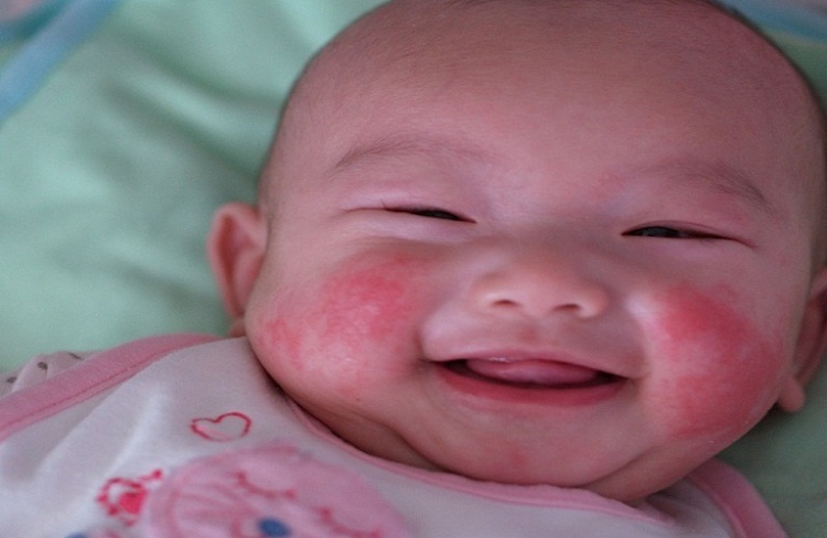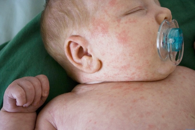 - Trên cơ thể bé xuất hiện các vết mẩn đỏ, nổi mụn.