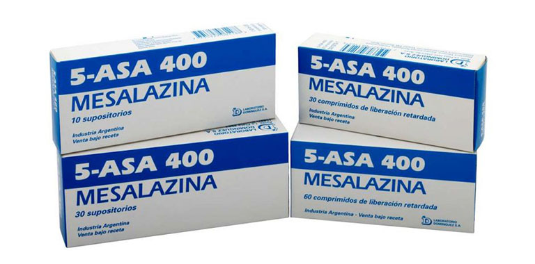 - Mesalazine (tên thương hiệu Asacol, Pentasa và Salofalk) được dùng bằng đường uống trong thời gian bùng phát với liều hàng ngày 3-4 g, sau đó giảm dần khi bệnh thuyên giảm với liều lượng 1 g mỗi tuần